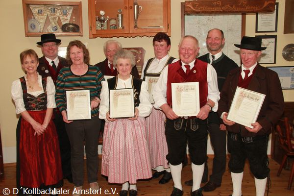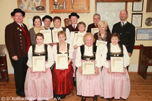 Ehrung für 20, 30, 60 und 65 Jahre aktive und passive Mitgliedschaft bei den Kollbachtaler Trachtlern: sitzend, von links Ramona Melzer, Susanne Biste, Lina Grabmeier und Helene Melzer; stehend, von links Vorstand Alois Bachmaier, Karin Popp, Martin Hofbauer, Rosa Eiblmeier, Konrad Hofbauer, Christa Biste, Maria Kudell und Bürgermeister Alfons Sittinger.
